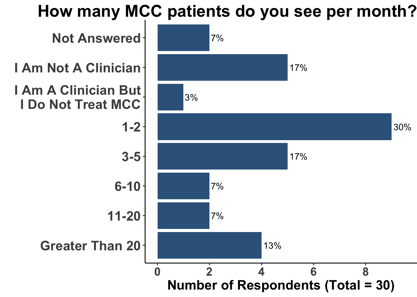 Attendees represented a range of institutions, including Massachusetts General Hospital, Mass Eye and Ear Infirmary, University of Washington, Moffitt Cancer Center, Dana-Farber Cancer Institute, Brigham and Women’s Hospital, Northwestern University, and the National Institutes of Health. Their experience managing Merkel Cell Carcinoma (MCC) varied (Figure 2).