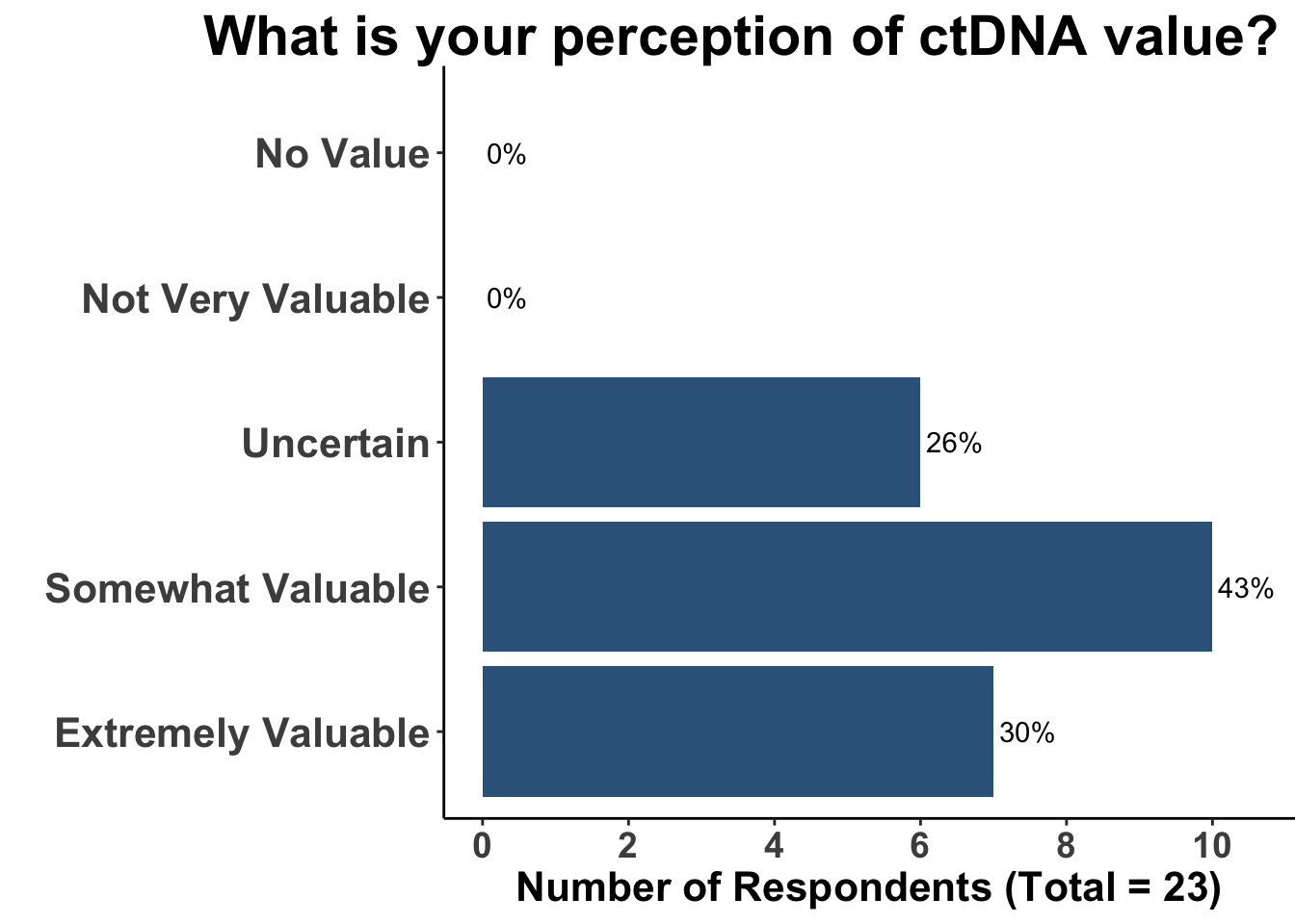 Despite its increasing use, perceptions of ctDNA’s value remain mixed. While most respondents acknowledged its potential, 26% remained uncertain about its clinical utility (Figure 5). The majority rated ctDNA as somewhat (43%) or extremely valuable (30%), with no negative ratings—suggesting broad recognition of its promise, though consensus on its role has yet to emerge.