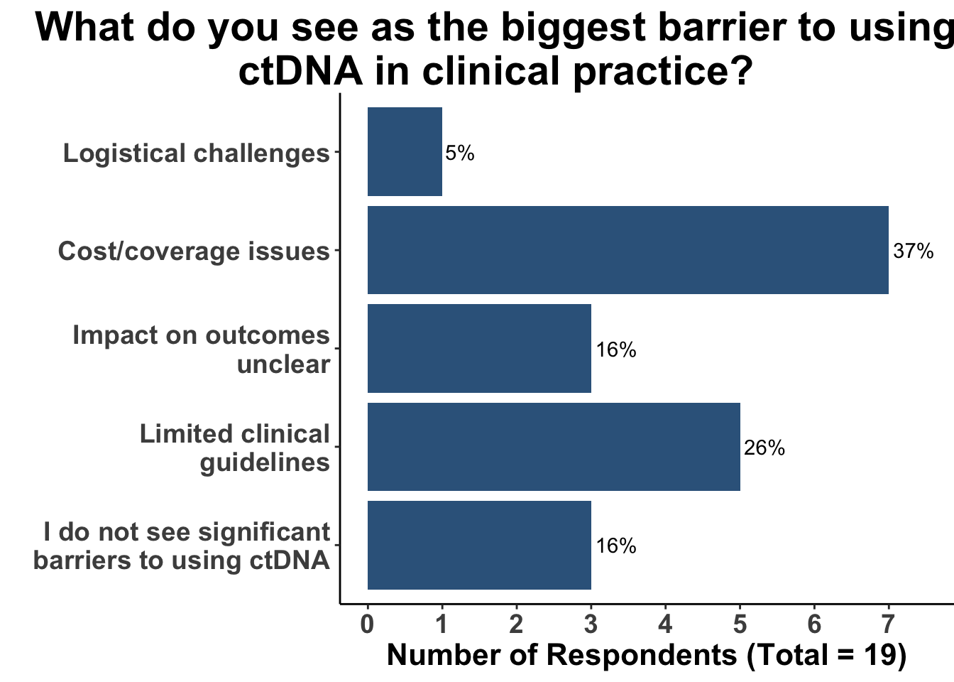 While interest in ctDNA is rising, several factors limit its broader clinical adoption. In our survey, cost and coverage issues emerged as the most frequently cited concern (33%), followed by the lack of clear clinical guidelines (24%). Additionally, some clinicians expressed uncertainty about ctDNA’s impact on clinically meaningful patient outcomes (Figure 6).