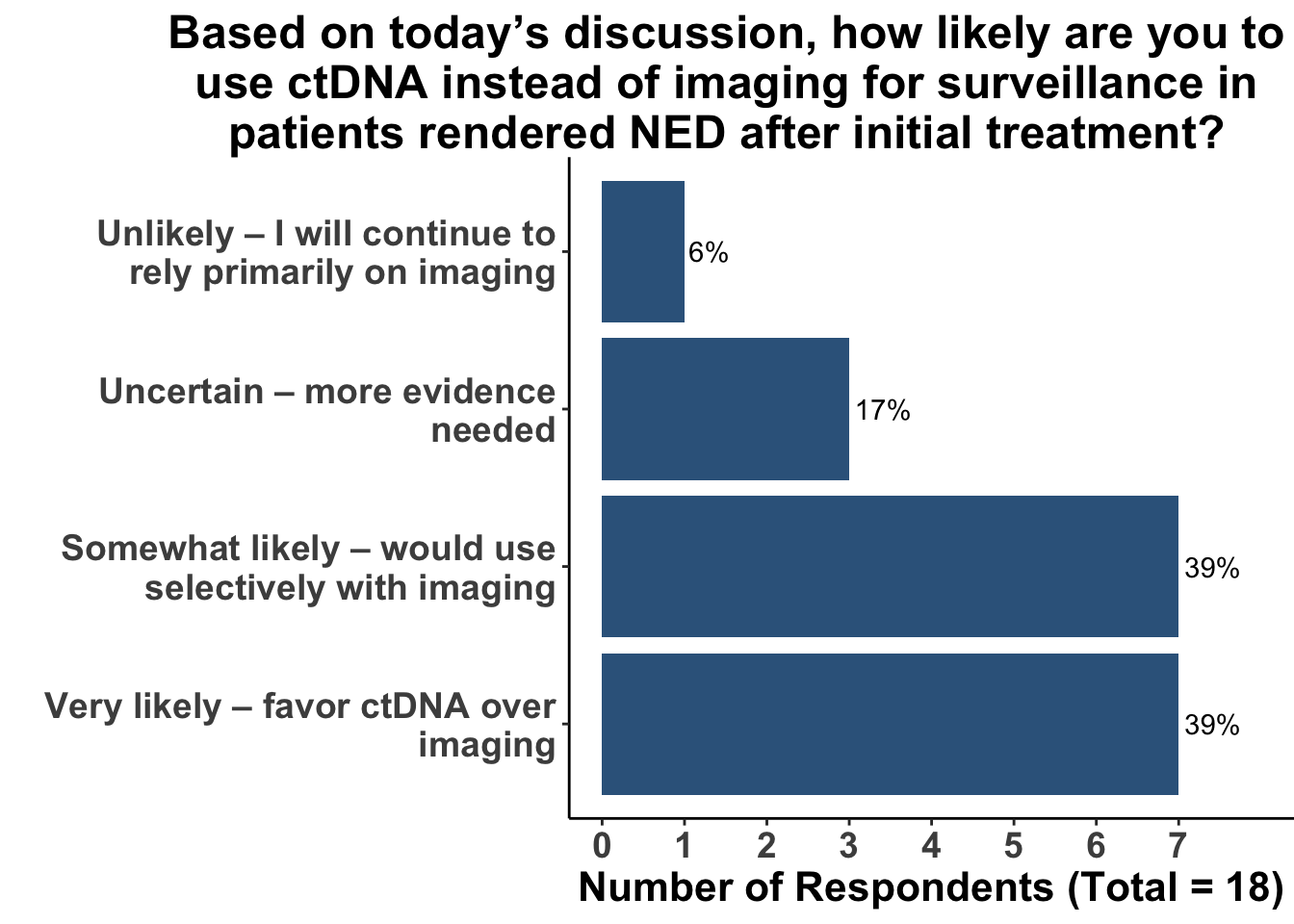 After reviewing the study, clinicians were asked whether they would consider incorporating ctDNA into surveillance in place of imaging. The responses reflected a clear interest in ctDNA’s potential, with 78% of respondents at least somewhat likely to integrate it into their surveillance strategies. Notably, 39% indicated they would favor ctDNA over imaging entirely (Figure 7). Still, 17% remained uncertain, emphasizing the need for continued clinical evaluation of ctDNA’s role in routine practice.