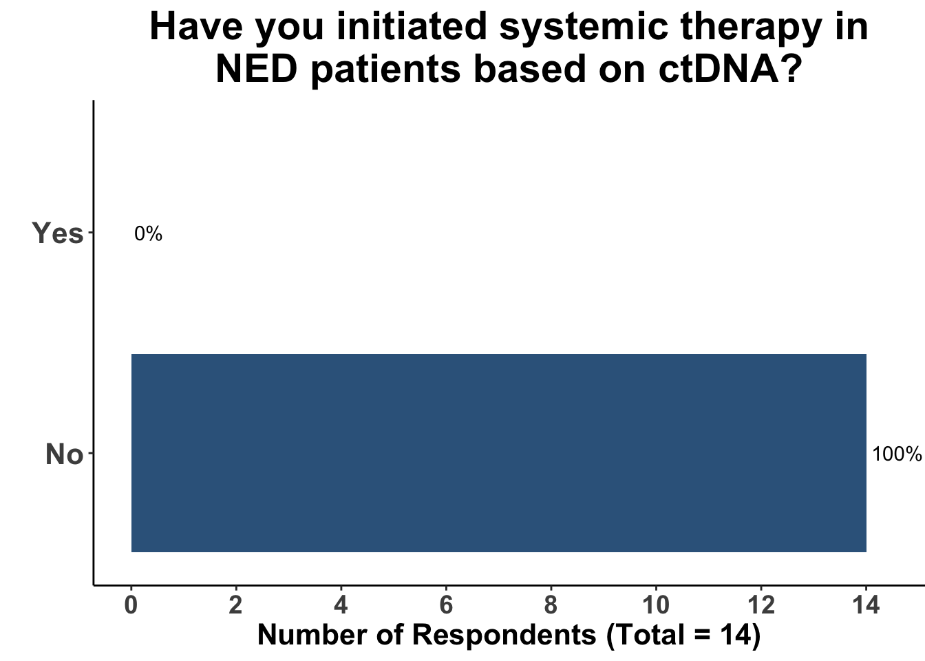 While ctDNA is increasingly accepted for surveillance, its role in guiding treatment decisions remains unclear. A key unresolved question is whether ctDNA positivity alone, without imaging or biopsy confirmation, should warrant systemic therapy initiation. While ctDNA positivity suggests residual disease, initiating systemic therapy without imaging or biopsy confirmation remains highly uncertain, as it lacks the same level of clinical confidence. Although preemptive intervention is conceptually appealing, enthusiasm for acting on ctDNA positivity alone remains low, with no respondents initiating systemic therapy without additional clinical context (Figure 8).