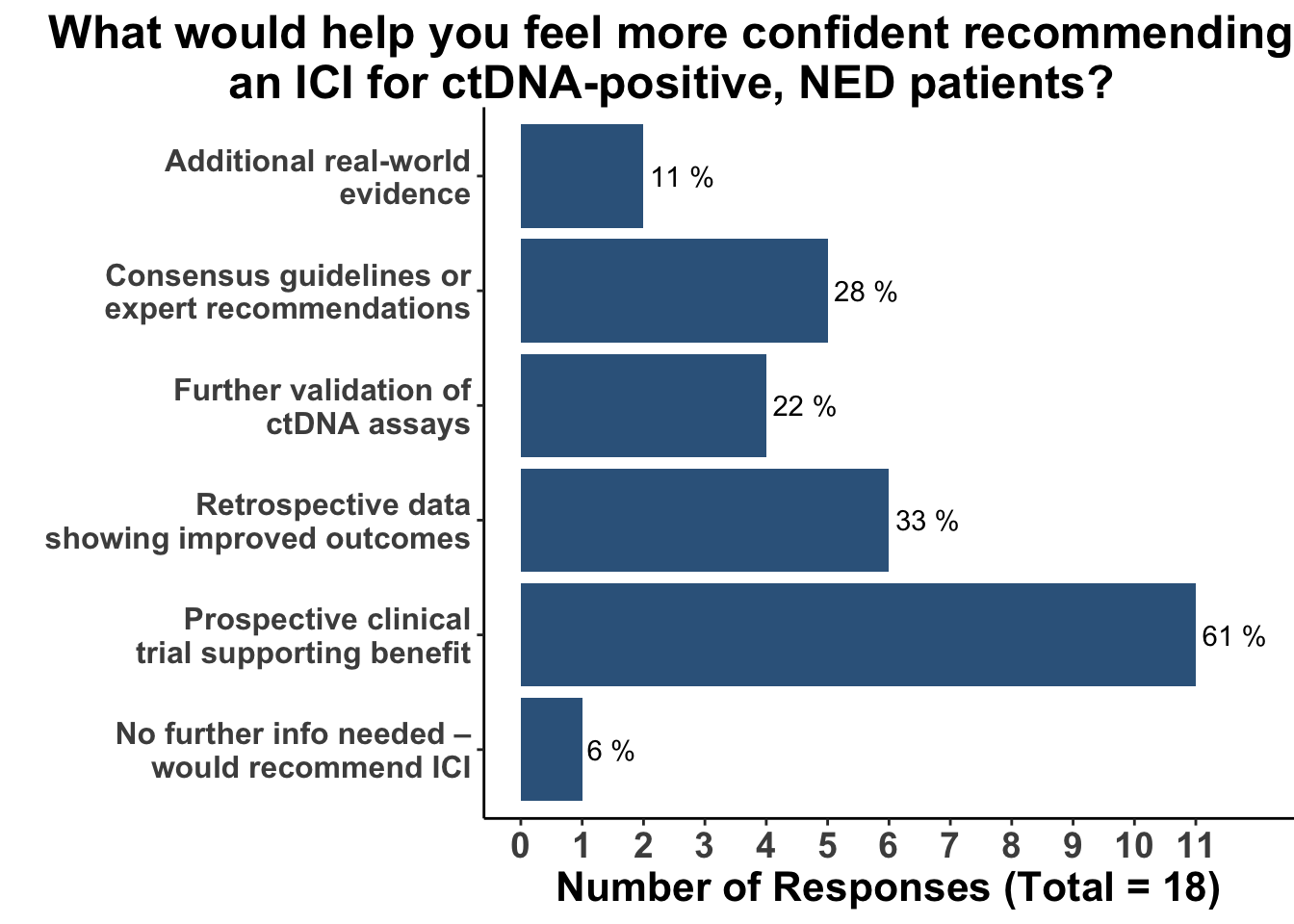 To understand what might shift clinical practice, we asked clinicians what additional evidence would make them more confident in recommending ICI in this setting. The strongest support for ctDNA-driven intervention came from those emphasizing the need for rigorous prospective validation, with 61% citing clinical trial data demonstrating improved outcomes as a key factor. Additional priorities included further validation of ctDNA assays (22%) and inclusion of testing recommendations in consensus guidelines from expert panels (28%), reflecting the importance of clear standards for clinical use (Figure 10).