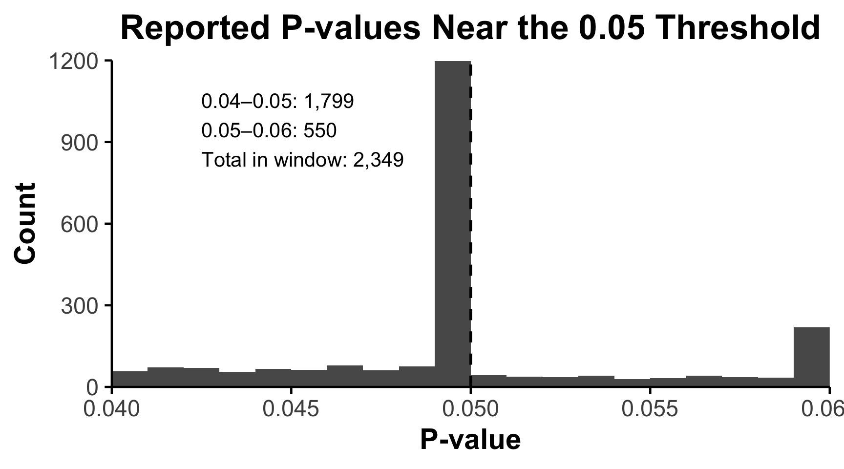 If selective reporting is occurring, we would expect to see more values just below 0.05 than just above it