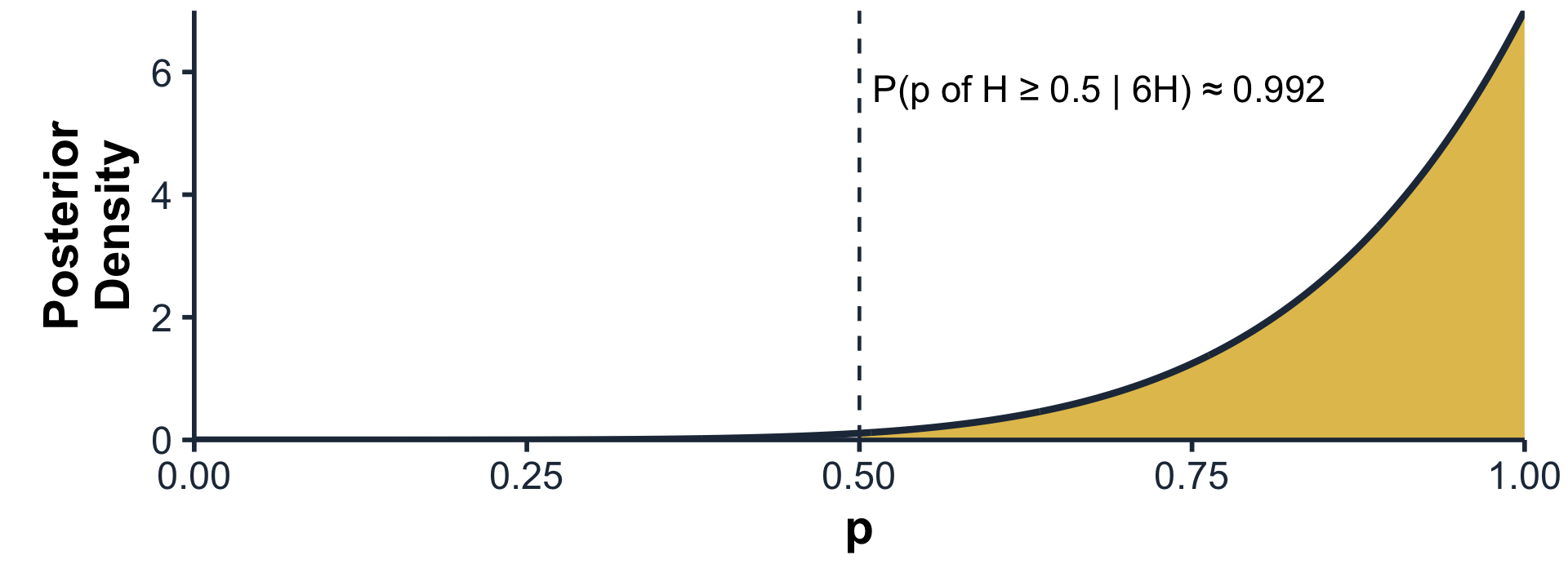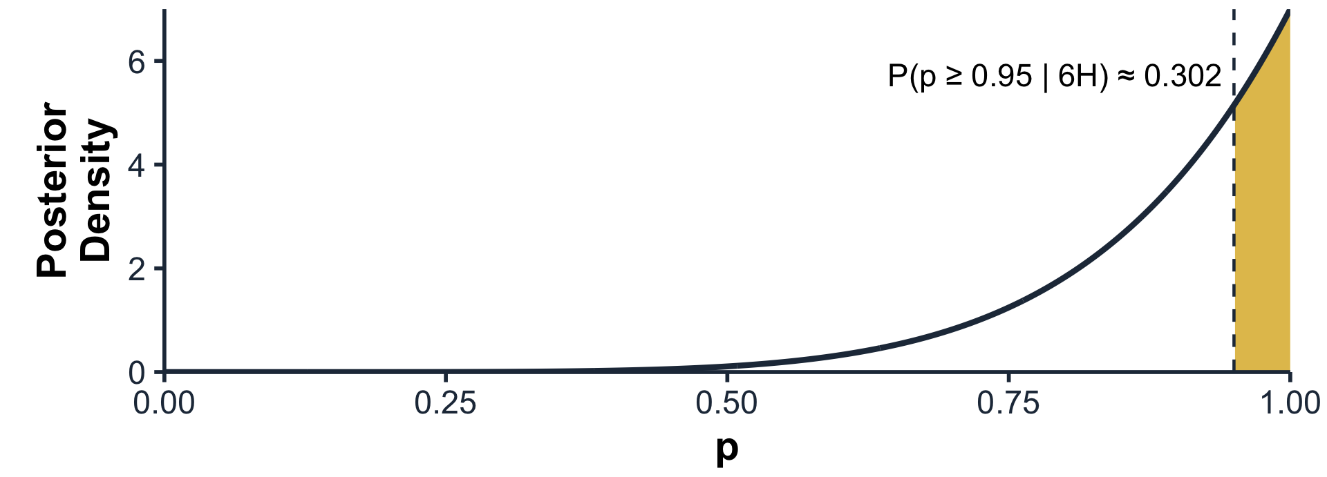 P(p | 6H) ∝ P(p) · P(6H | p) ⇒ Posterior: Beta(7, 1)
