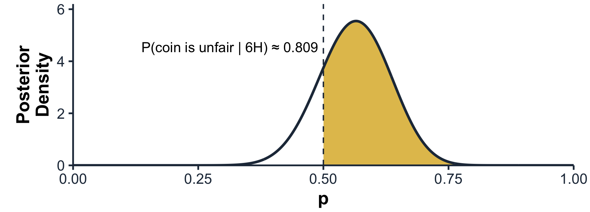 P(p | 6H) ∝ P(p) · P(6H | p) ⇒ Posterior: Beta(27, 21)